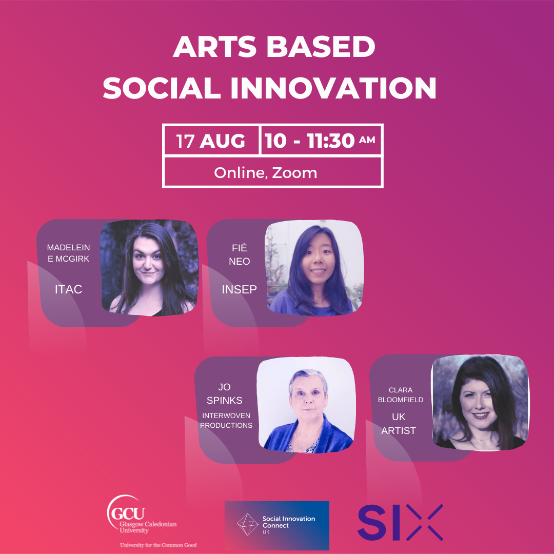 SI Connect is a collaboration between GCU (Glasgow Caledonian University) and SIX (Social Innovation Exchange) as part of an EU-funded programme supporting the establishment of national social innovation ‘competence centres’ across Europe. We hope this event can be useful to any socially engaged artist, social innovator or stakeholder who is UK based and interested in the intersection of participatory art and social innovation.